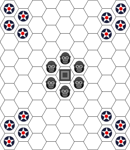 Between 2-16 players all flying Curtiss Falcons confront King Kong atop the Empire State building. The Falcons set up in one of the American Roundel Spaces, and Kong in one of the gorilla spaces.